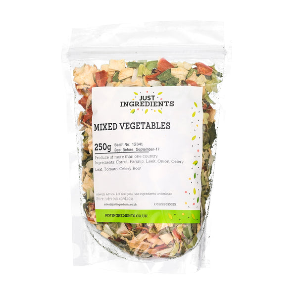 Add directly to soups, stews, casseroles, and curries for a pop of colour, flavour, and texture! Take a pack on your next camping trip alongside noodles and stock to make an instant vegetable soup, easy to carry and require no prep, ideal for cooking on the move. To rehydrate Mixed Vegetable Flakes, pour over enough boiling water to cover and leave for up to 20 minutes to soften. Stir into rice, pasta, and couscous dishes.DISCLAIMER